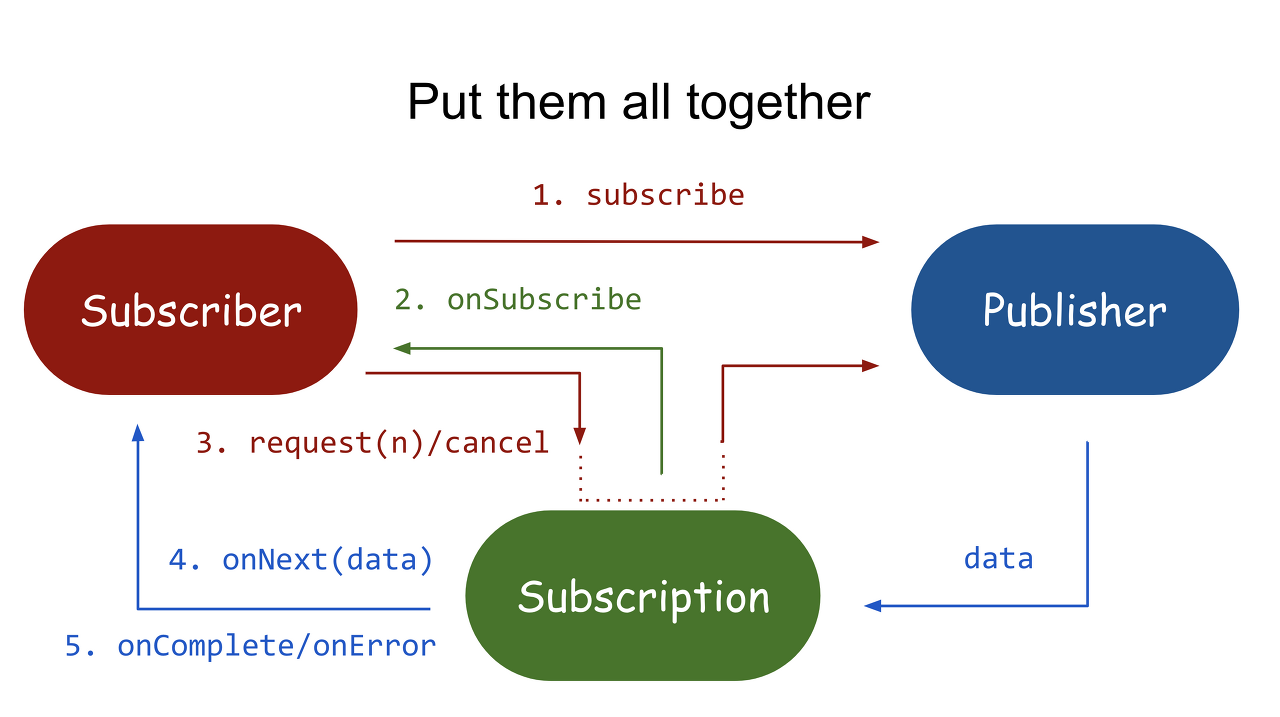 - Publisher는 Subsription을 통해 Subsriber의 onNext에 데이터를 전달하고, 작업이 완료되면 onComplete, 에러가 발생하면 onError 시그널을 전달한다.