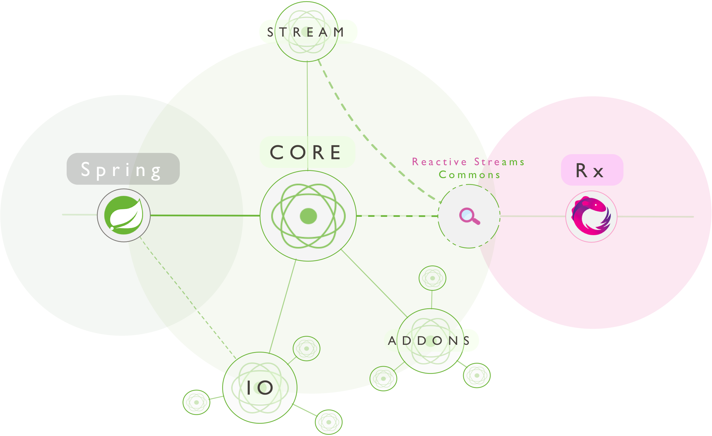 Reactor는 Spring 팀이 만든 Java 프레임워크다. Reactive Streams 상에서 직접 빌드되므로 브릿지가 필요 없고, Reactor IO 프로젝트는 Netty, Aeron과 같은 저수준 네트워크 런타임에 대한 래퍼를 제공한다. Reactive 세대 분류 체계에서 4세대 라이브러리에 해당된다.