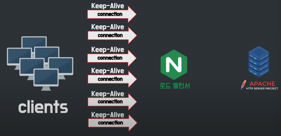 그런데 위에 그림에서 보이듯이, 여기서 클라이언트 수가 많아지면 동시에 연결되어 있는 커넥션 수가 더 많아진다. 게다가 keep-alive를 설정해놔서 커넥션이 끊기지 않으니 동시 커넥션 수는 더 많아진다. 그러면 어느 순간 더 이상 새로운 커넥션을 만들 수가 없어진다.