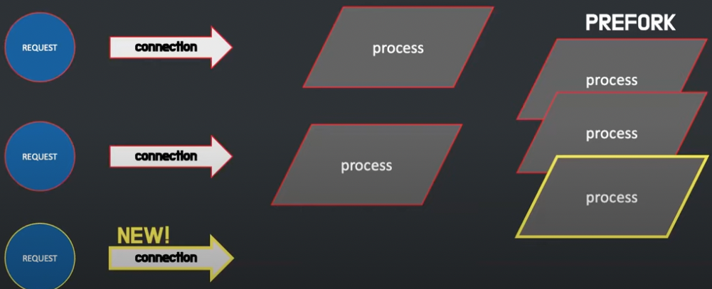 아파치는 본래 정적 컨텐츠만 처리하는 웹서버이다. 초기 구조를 보면 클라이언트로부터 요청이 들어올 때마다 process를 할당한다. 근데 process를 매번 만들기는 부담이 있으니 prefork 방식을 사용하는데, 미리 process들을 만들어두고 새 요청이 들어올 때마다 꺼내서 할당하는 것이다. 그리고 만들어뒀던 프로세스가 모두 할당되면 추가로 프로세스를 만든다.