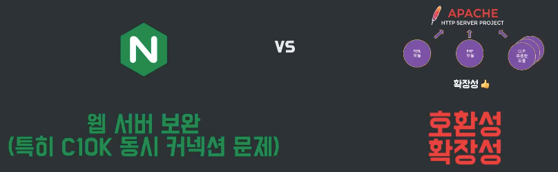 초창기의 Nginx는 Apache server와 같이 사용하기 위해 등장했다. 아파치 서버가 가진 구조적 한계를 Nginx가 보완하는 구조로 많이 사용됐다.