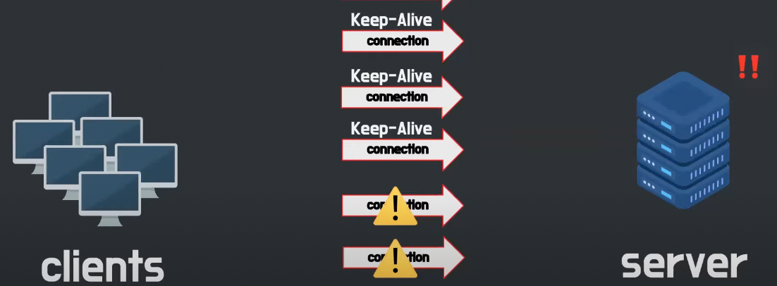 그런데 위에 그림에서 보이듯이, 여기서 클라이언트 수가 많아지면 동시에 연결되어 있는 커넥션 수가 더 많아진다. 게다가 keep-alive를 설정해놔서 커넥션이 끊기지 않으니 동시 커넥션 수는 더 많아진다. 그러면 어느 순간 더 이상 새로운 커넥션을 만들 수가 없어진다.