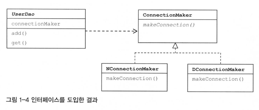 → 이 인터페이스를 사용하는 UserDao 입장에서는 ConnectionMaker 인터페이스 타입의 오브젝트라면 어떤 클래스로 만들어졌든지 상관 없이 makeConnection 메소드만 호출하면 커넥션 타입의 오브젝트를 받을 수 있다.