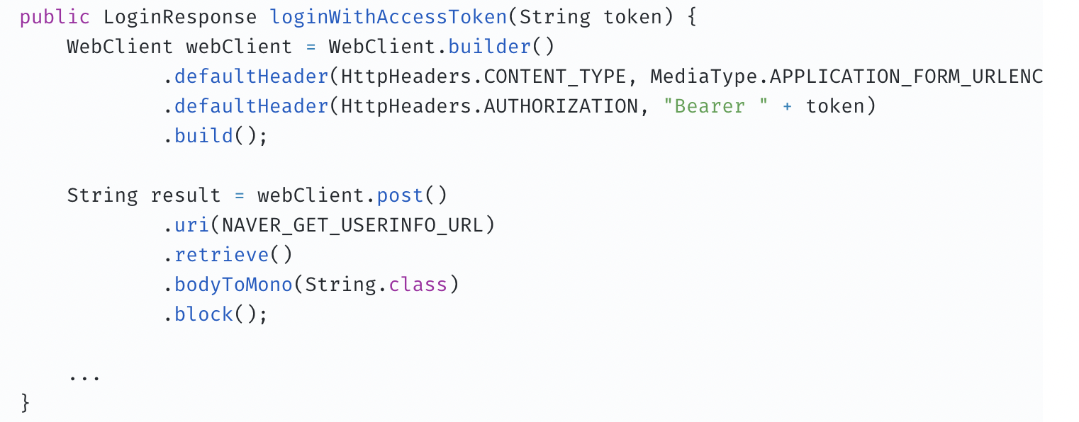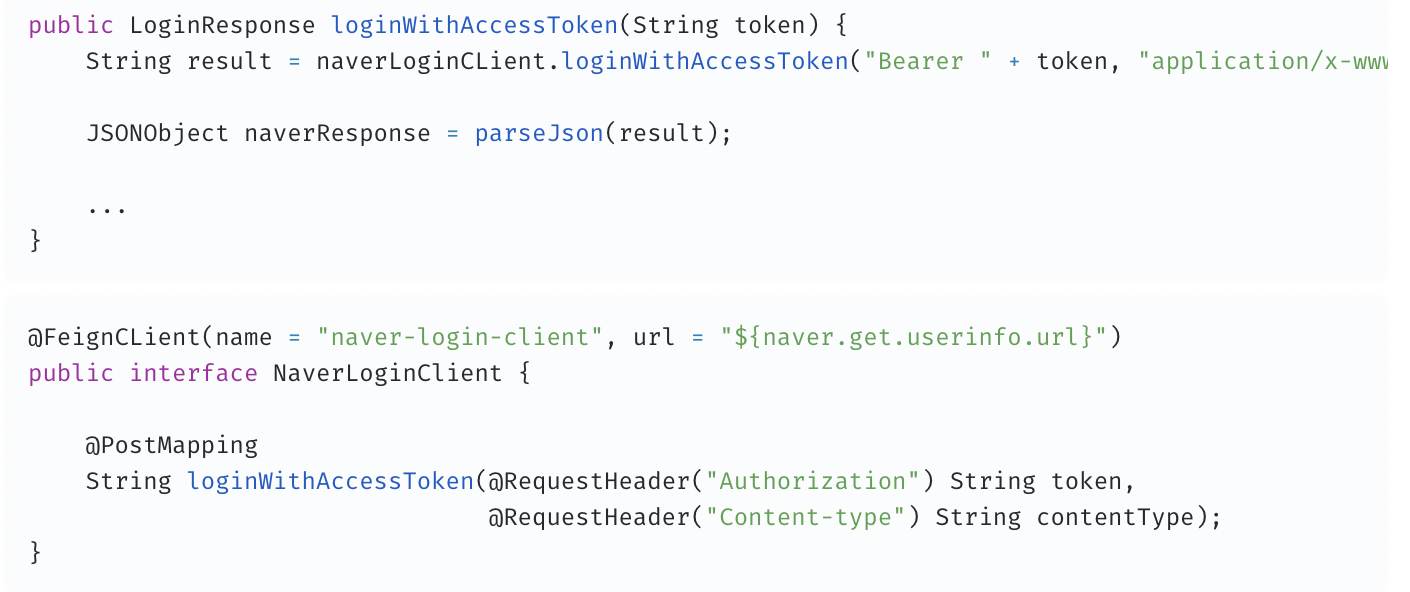 | 관심사의 분리 | 둘다 Login Response에서 NaverProfile API를 호출하고 있다. 만약 NaverProfile의 API의 URI가 바뀔 때 RestTemplate은 직접 호출하는 메소드 부분에 헤더 같은 설정정보가 다 있으니 Login Response가 같이 책임지게 된다. 반면 Open Feign은 주요 관심사가 아닌 설정 정보들은 인터페이스에서 설정하고, 직접 호출하는 부분은 그냥 메소드만 적혀 있으니까 LoginResponse는 본인이 반환 받을 객체에 대해서만 책임을 가져간다. |