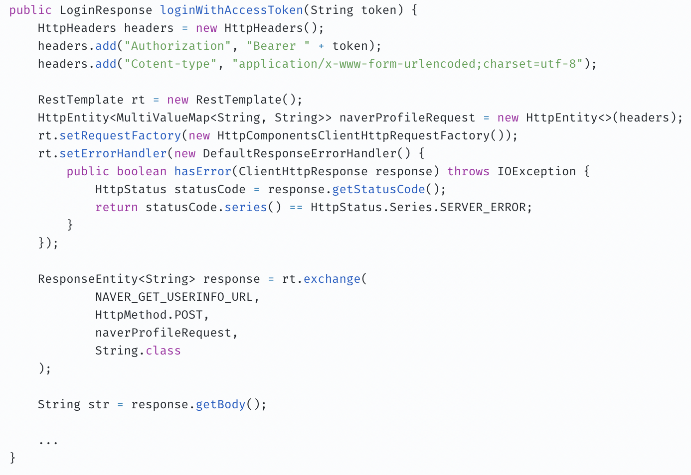 | 예외 처리 | 만약 Login Responese가 NaverProfile 호출할 때 없는 유저에 대한 정보로 요청한다고 가정하자. NaverProfile 측에서는 없는 유저에 대한 요청이므로 서버가 요청받은 리소스를 찾을 수 없다는 404 Not Found 를 준다. 근데 RestTemplate을 쓰면 Login Response 입장에서는 NaverProfile의 내부 문제로 인해 응답을 못 받은 거니까 Internal Server Error가 발생했나보다 하며 500을 준다. 실제론 500이 아니라 404를 반환하는게 맞잖아?? 이런 문제를 대처할 때 Rest Template은 try-catch로 예외처리를 하지만, Open Feign은 예외 핸들링을 위한 Error Decoder를 제공한다. |