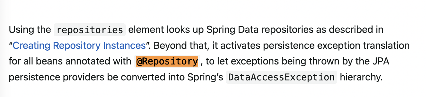- 아레 첫번째 사진에서는 it activates persistence exception translation for all beans annotated with @Repository 라고 되어 있다.