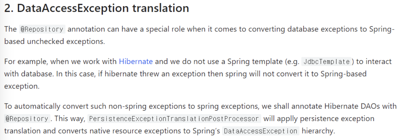 - 아레 첫번째 사진에서는 it activates persistence exception translation for all beans annotated with @Repository 라고 되어 있다.