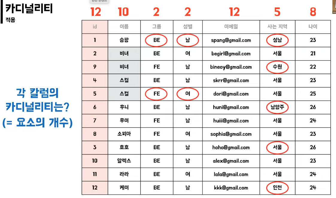 - 카디널리티가 높은 컬럼. == 중복도가 낮은 컬럼