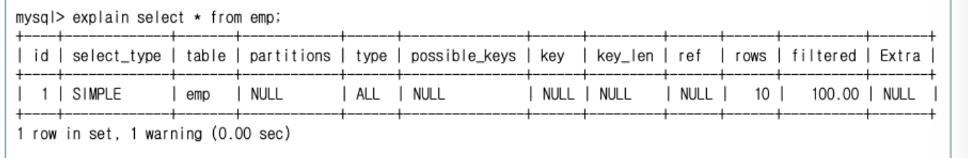 이 연산을 통해 MySQL은 옵티마이저로부터 어떻게 쿼리가 실행되는지 어떤 순서로 테이블들이 조인되는지를 볼 수 있다.