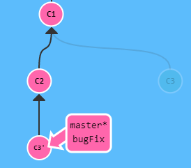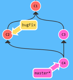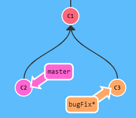 여기서 master를 bugFix 위치로 옮기기 위해 master로 가서 git rebase bugFix를 하면 아래 모습과 같아집니다.
