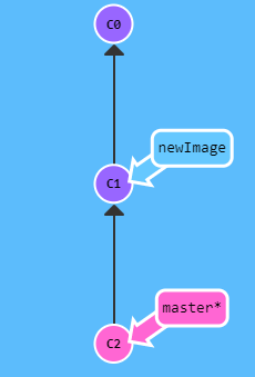 git branch newImage라는 명령을 통해 진행중이던 내용에 대해 branch를 만들 수 있습니다. 만들기만 하고 branch 위치에서 commit을 안하면 같은 commit에 대한 branch만 존재하는, 아래와 같은 모습이 됩니다.