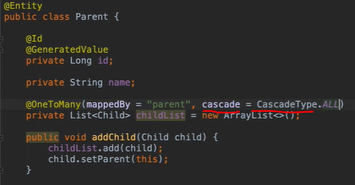 예를 들어 부모 엔티티를 저장할 때 자식 엔티티도 함께 저장하거나, 부모 엔티티를 삭제할 때 관련된 자식엔티티도 함께 삭제하고 싶을 때 사용합니다.
