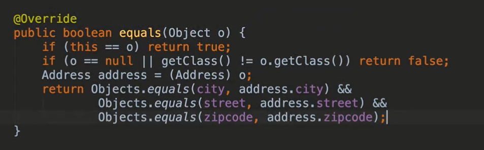 따라서 이 equals()를 Address 클래스에서 오버라이드해야 한다.