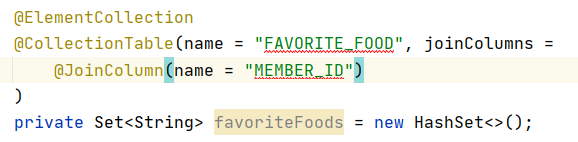 값 타입 매핑은 @ElementCollection으로 해야 하고, 테이블명 정하는 건 CollectionTable에서 name을 통해 할 수 있다. MEMBER_ID를 가지고 JOIN하겠다는 의미이다.