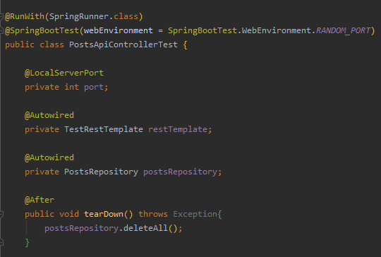 @WebMvcTest는 JPA기능이 작동하지 않고 Controller와 ControllerAdvice 등 외부 연동과 관련된 부분만 활성화되므로, 지금처럼 JPA 기능까지 테스트를 같이할 땐 @SpringBootTest, TestRestTemplate을 사용한다. TestRestTemplate으로 설정 시 자동으로 빈이 생성되고 RestTemplate의 처리가 가능하다. 사용하면 실제 서버가 동작하는 것처럼 테스트를 수행할 수 있다.