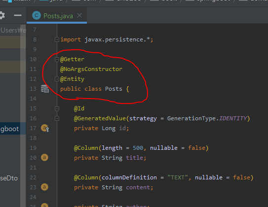 @Getter와 같은 롬복 어노테이션은 코드를 단순화시키지만 필수 어노테이션은 아니다. 따라서 @Entity를 클래스에 가깝게 두자.