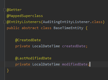 JPA Entity 클래스들이 BaseTimeEntity를 상속할 경우 그 필드들인 createdDate, modifiedDate를 컬럼으로 인식하도록 한다.