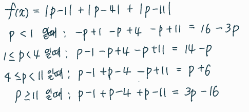 따라서 x좌표만 고려한다면 식은 |p - 1| + |p-4| + |p-11|이고, 이 값이 최소가 되는 p를 구해서 그때의 최솟값을 구해야 한다.
