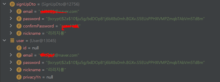 일단 들어오는 DTO와 매핑된 User 객체에서 privateYn은 똑같이 null이다.