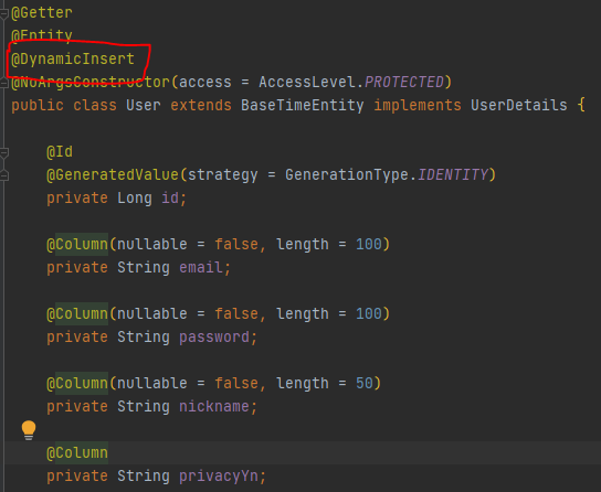즉, @DynamicInsert를 사용해서 아예 null값이 되었을 때 쿼리문에서 제외되도록 해야, DDL에 설정한 default값으로 잘 들어가진다.