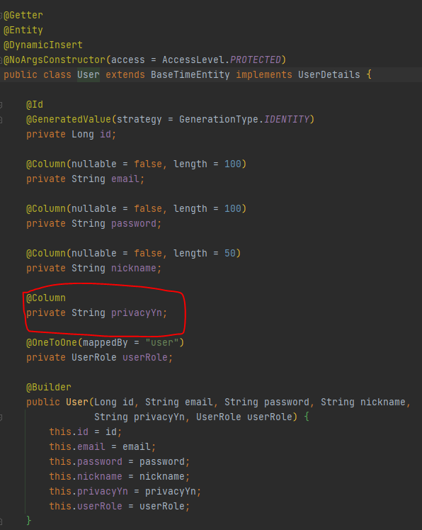 일단 Entity 와 DB는 이렇게 되어있다. 손봐야 할 컬럼은 privacyYn이다.