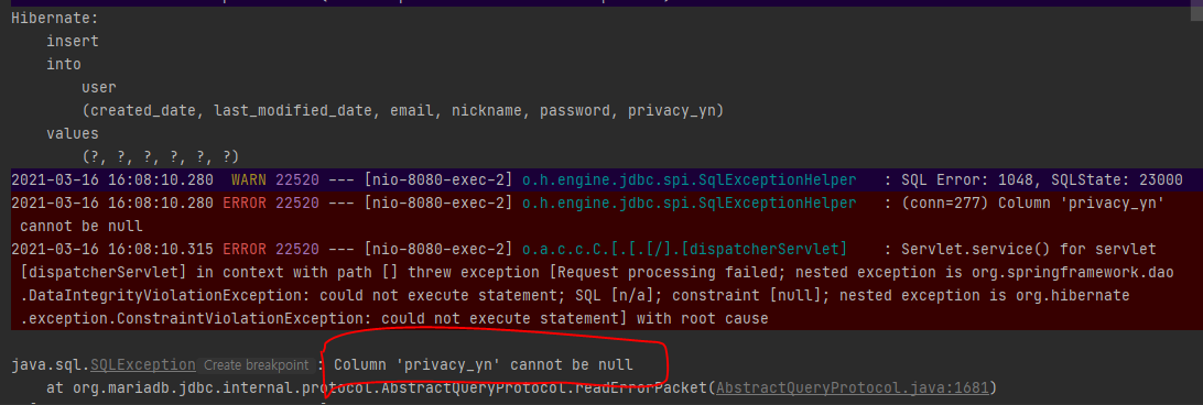 java.sql.SQLException: Column 'privacy_yn' cannot be null