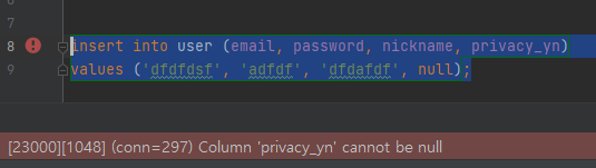 privateYn을 null로 명시해서 insert문을 실행하면 위와 같은 에러가 발생한다.