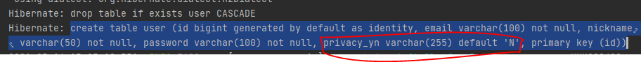 그런데 그게 아니라, application.yml에서 jpa.hibernate.ddl-auto : create-drop 로 설정하고 서버를 구동시켰을 때 생성된 DDL을 보면 그때 default가 적용되어 있는 걸 확인할 수 있다. 즉, 저 어노테이션은 auto-ddl을 사용할 때에 적용되는 것이다. (본 포스팅의 마지막 부분에 자세하게 적혀 있다.)
