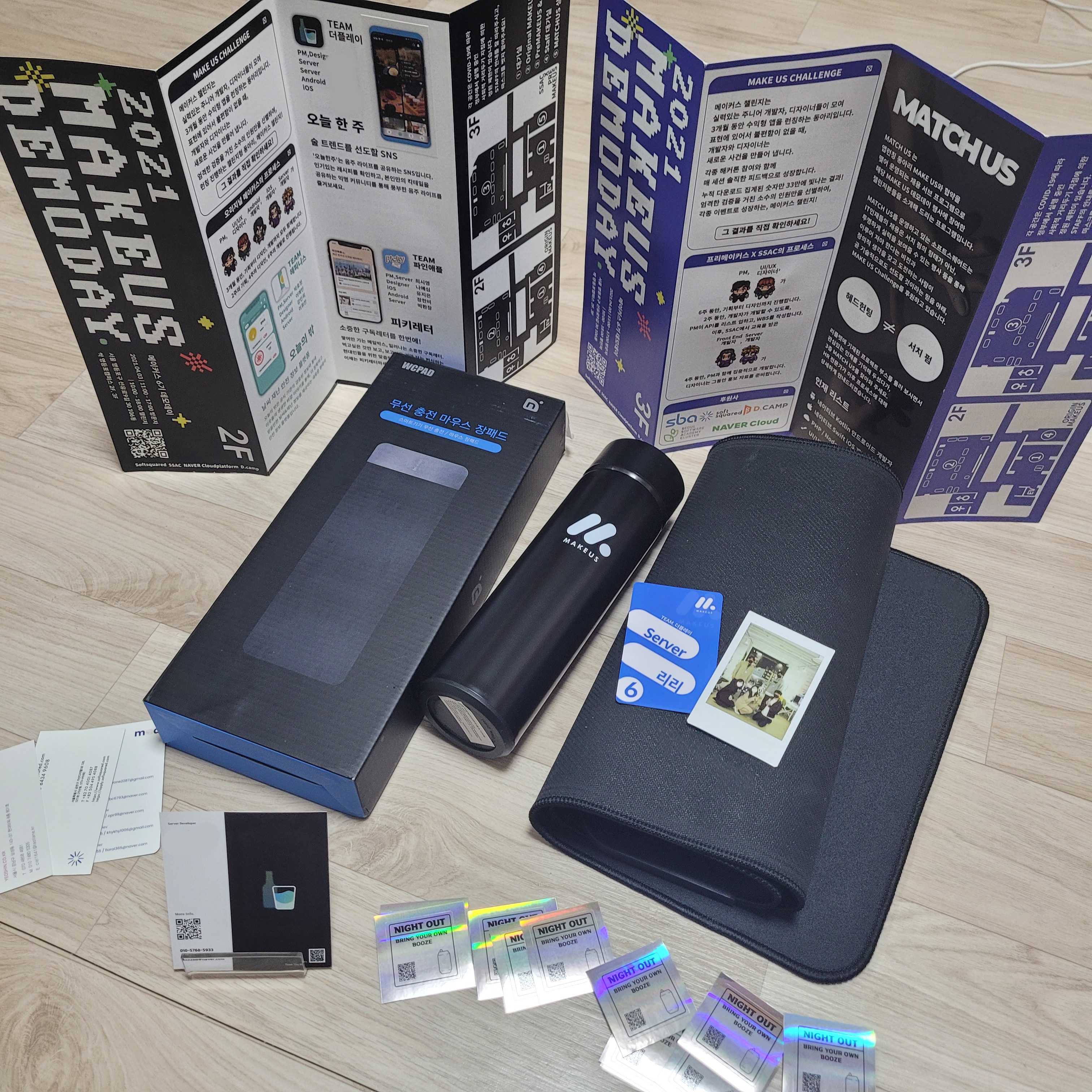 집 갈때 이렇게 선물을 받았어요. 무선충전이 되는 마우스 패드랑 텀블러였습니다. 메이커스 새겨진 텀블러예요.