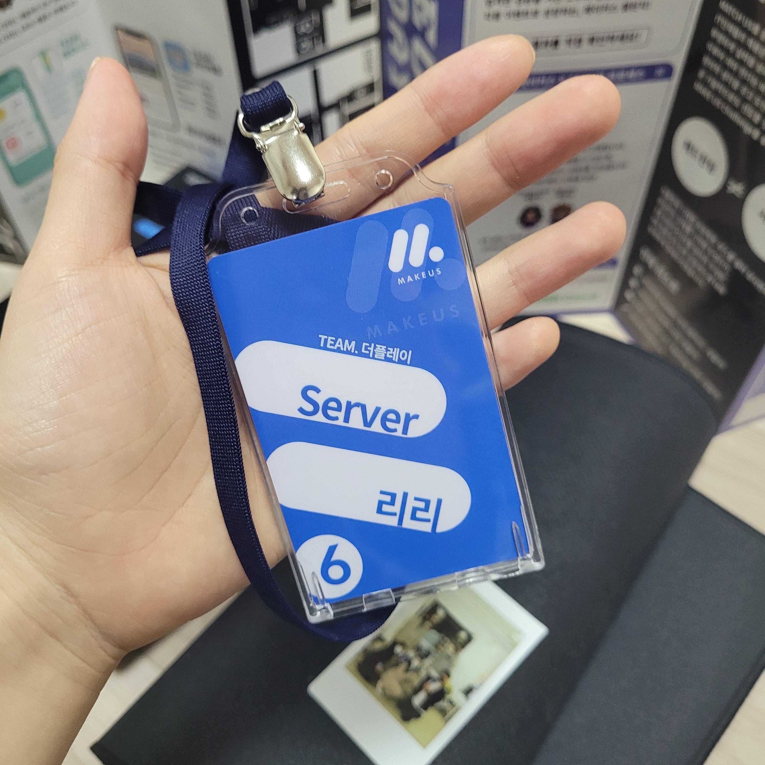 메이커스는 닉네임으로 활동하기 때문에 저렇게 포지션과 닉네임이 적혀 있어요. 이건 부스 운영 시작할 때 동아리에서 나눠준 목걸이입니다. 저는 team 더플레이의 서버 개발자 '리리'라고 해요. ㅋㅋㅋ 카드 뒷면을 보니 수료 인증 문장이!