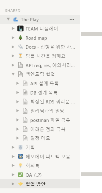 저희 팀은 노션을 적극적으로 사용했답니다! Page 목록만 봐도 느껴지시죠? ㅎㅎ 특히 백엔드 팀원이 저 포함 두 명이어서 협업 툴을 자주 사용했어요. '어려운 점과 극복'에 기술적으로 고민한 흔적도 남기고요. (아직도 그 고민 진행 중;;) '릴리님과의 밀당'은 진짜 밀당이 아니라, 기술적 구현의 한계(?) or 실력의 한계(?)로 초기 기획 의도와 달라진 부분을 적은 거예요. 추후에 더 공부해서 초기 의도대로 구현해 내려고 기록해놨습니다. ㅎㅎ