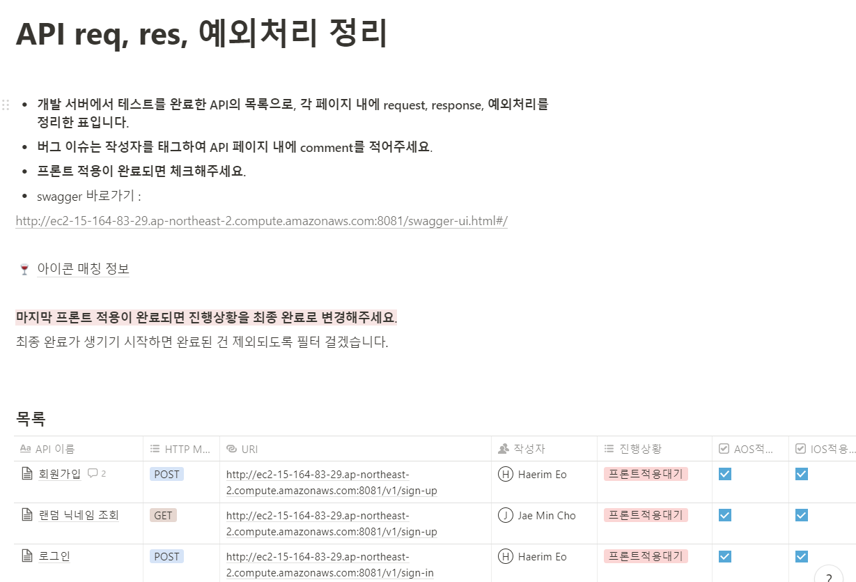 Swagger를 만들긴 했는데 예외처리 내용을 상세하게 적는 게 한계가 있어서 노션도 같이 사용했어요.