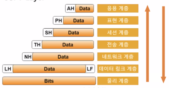 응용계층에서 내려온 데이터부터 시작해서 계속 헤더가 붙는다. 이 헤더에는 그 계층에 대한 정보가 기록되어 있다.