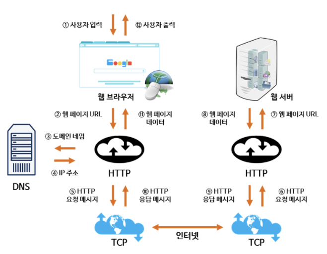 이렇게 생성된 http 요청 메시지는 tcp 프로토콜을 사용해서 인터넷을 거쳐서 해당 IP 주소의 컴퓨터로 전송된다.