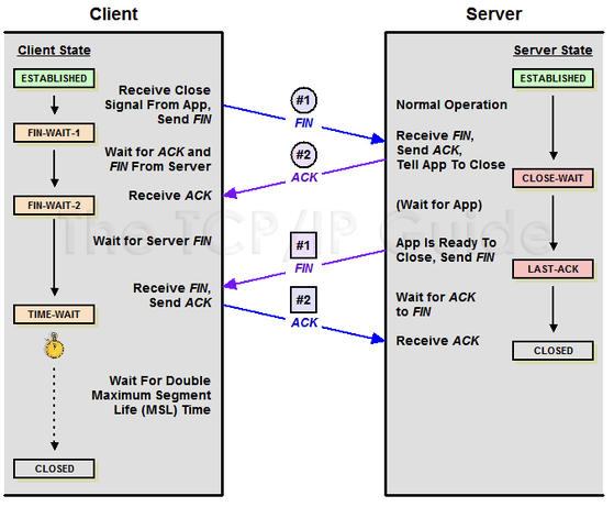 TCP의 연결을 해제하는 과정. TCP에서 장치 간의 세션을 종료하기 위해 사용한다.