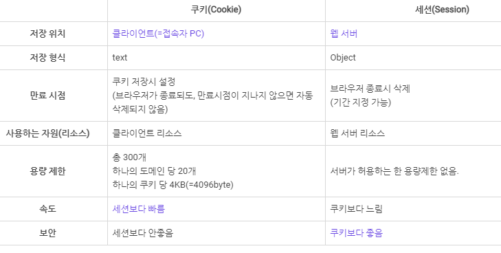 - 차이점 : 저장위치, 저장형식, 용량제한, 만료시점 등이 다름.