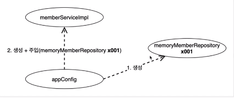 appConfig는 memoryMmeberRepository 객체를 생성하고 그 참조값을 memberServiceImpl을 생성하면서 생성자로 전달하므로, 클라이언트인 memberServiceImpl 입장에서 보면 의존관계를 마치 외부에서 주입해주는 것 같다고 해서, DI라고 한다. 우리말로 의존관계 주입 또는 의존성 주입 이라고 한다.