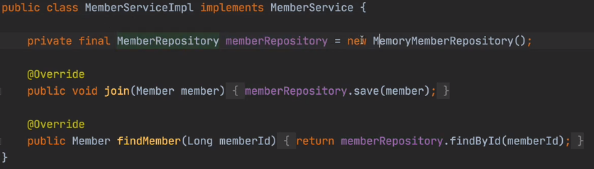 - privae final MemberRepository memberRepository = new MemoryMemberRepository;