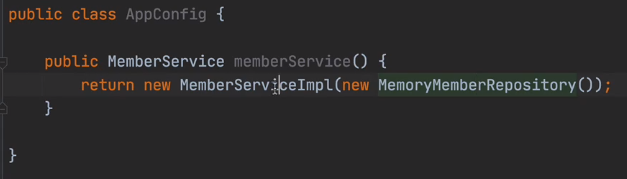기존에는 MemberService에서 MemberRepository의 구현 객체를 직접 지정했었다. 이런 걸 전부 AppConfig가 하게 하자.