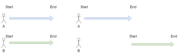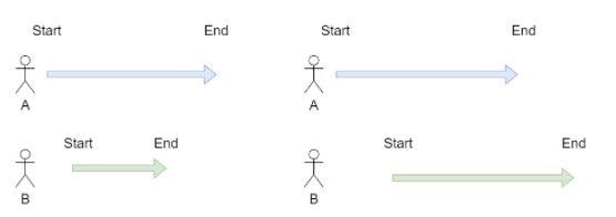 두 주체가 서로의 시작, 종료 시간과는 관계 없이 각자의 시간대로 수행시작과 수행 종료를 하는 것이다.