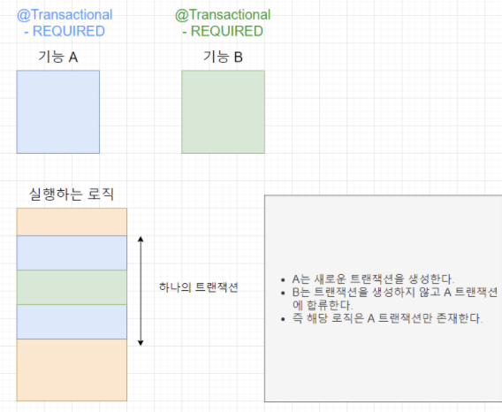 1. 기본 값은 REQUIRED로, 부모 트랜잭션이 존재하면 부모 트랜잭션에 합류하고, 부모 트랜잭션이 없으면 새로운 트랜잭션을 생성한다. 중간에 롤백이 발생하더라도 모두 하나의 트랜잭션이기 때문에 진행 사항이 모두 롤백된다.