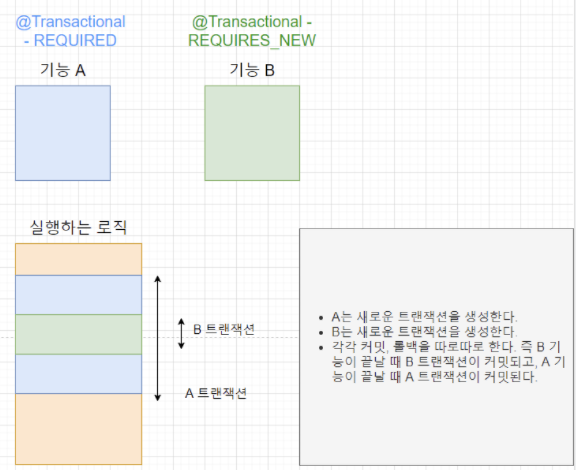 2. REQUIRES_NEW는 무조건 새로운 트랜잭션을 생성한다. 각각의 트랜잭션이 롤백되어도 서로 영향을 주지 않는다.