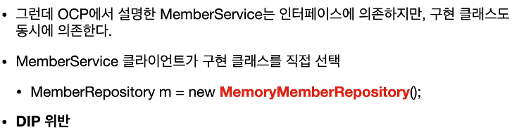 위 예시는 DIP를 위반한다. 추상체인 MemberRepository 외에 MemoryMemberRepository도 알고 있기 때문이다.