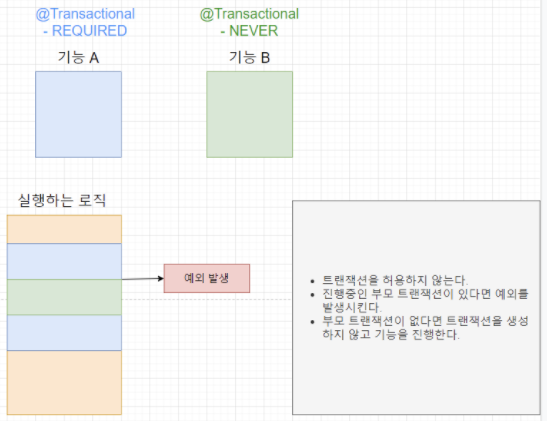5. NEVER는 트랜잭션을 생성하지 않는다. 부모 트랜잭션이 존재한다면 예외를 발생시킨다.
