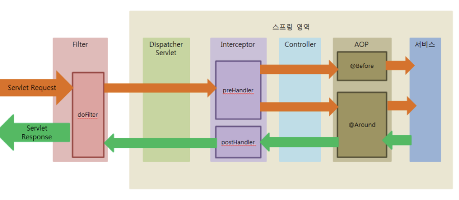 Interceptor와 Filter는 Servlet단위에서 실행되고 반면 AOP는 메소드 앞에서 Proxy 패턴의 형태로 실행된다.