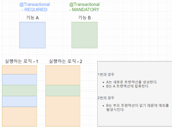 3. MANDATORY는 부모 트랜잭션에 합류하고, 부모 트랜잭션이 없으면 예외를 발생시킨다.