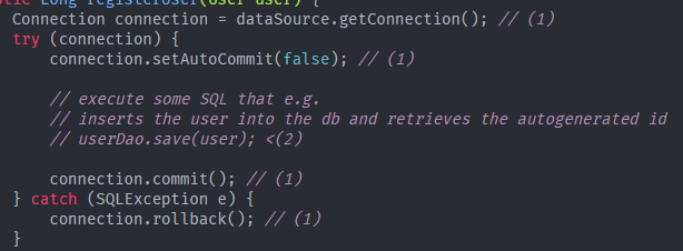 *참고로 setAutoCommit은 기본값이 true일 때 자동으로 커밋하는 코드다. 트랜잭션을 처리할 때는 false로 해야 한다. true로 해서 자동으로 커밋이 되어 버리면 여러 개의 쿼리문장이 동시에 작업되어야 할때 All or Nothing이 적용되지 않기 때문이다. 하나라도 안되면 전부 rollback되어야 하는데 한 쿼리씩 자동으로 바로 commit되면 안되잖아..!