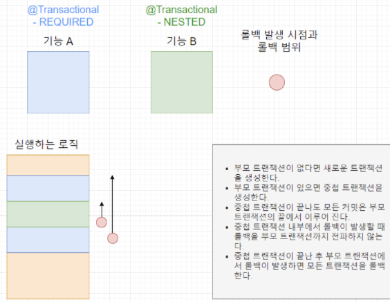 4. NESTED는 부모 트랜잭션이 존재한다면 중첩 트랜잭션을 생성한다. 중첩된 트랜잭션 내부에서 롤백이 발생하면 그 중첩된 트랜잭션의 시작지점 까지만 롤백된다. 중첩 트랜잭션이 커밋 가능하다면 부모 트랜잭션이 커밋될 때 같이 커밋되고, 부모 트랜잭션이 없으면 새로운 트랜잭션을 생성한다.