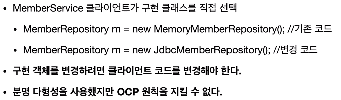 - 다형성만으로는 구현 객체를 변경할 때 클라이언트 코드도 함께 변경되어 버려서 쉽게 부품을 갈아 끼우듯이 개발할 수 없다. (MemberRepository의 구현체를 memory -> jdbc로 변경할 때 코드가 바뀌어 버리니까)