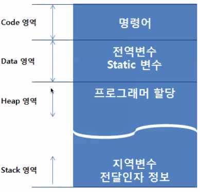 - Heap : 동적할당과 동적해제가 이뤄지는 곳으로 사용자가 직접 관리할 수 있는 메모리 영역임.
